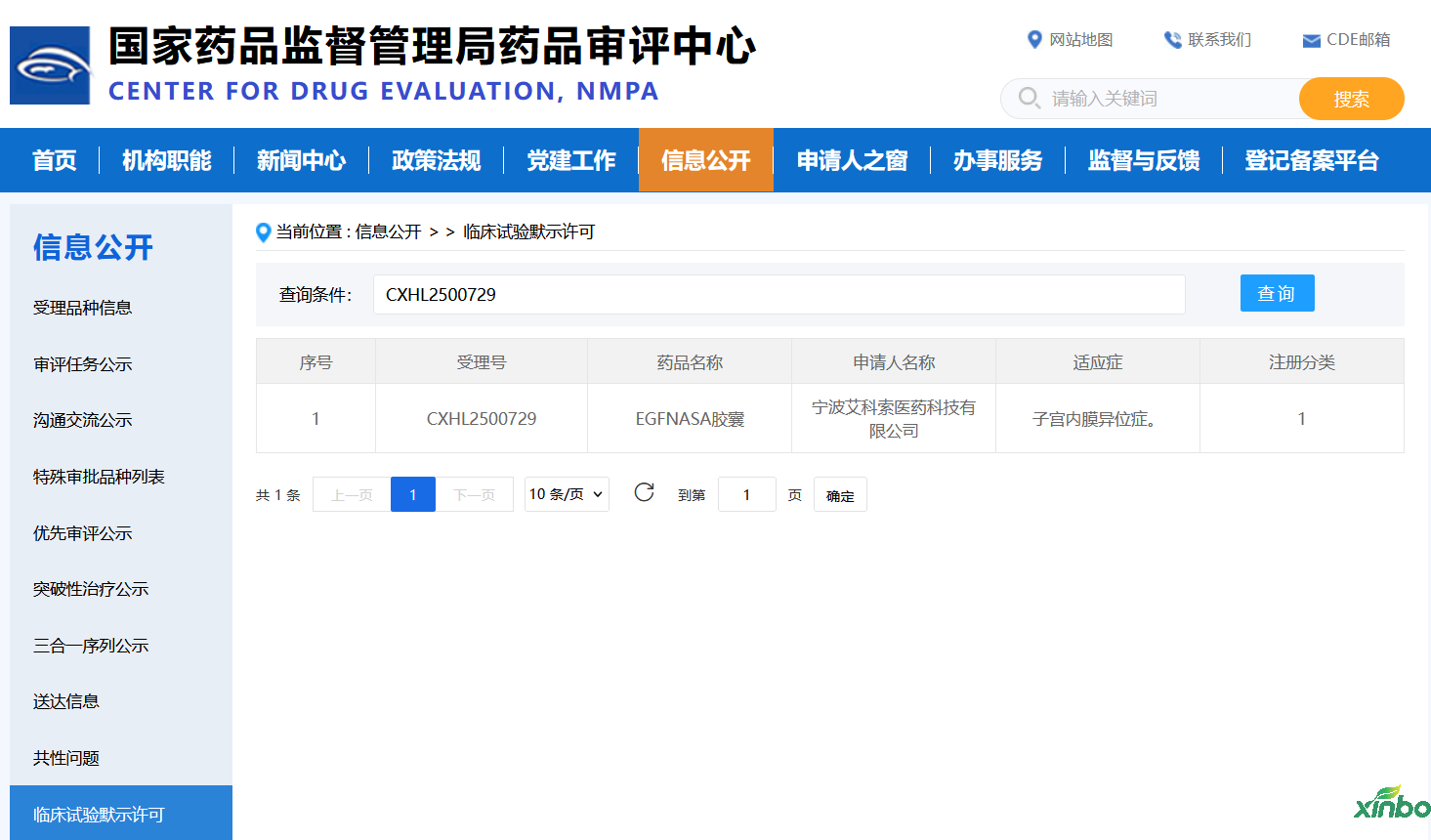 根据国家药监局药品审评中心(CDE)官网以及公开资料,山东欣博药物研究有限公司(以下简称“山东欣博”)助力宁波艾科索医药科技有限公司研发的“EGFNASA胶囊”(受理号:CXHL2500729)获得新药临床试验默示许可。