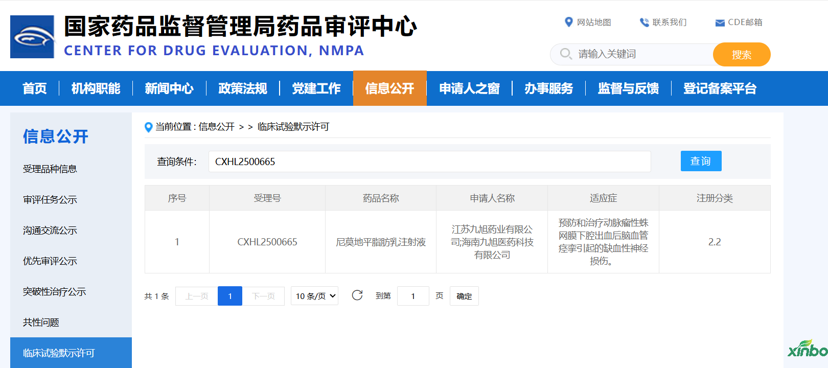 根据国家药品监督管理局药品审评中心官网以及公开资料,山东欣博药物研究有限公司(以下简称“山东欣博”)助力九旭药业“尼莫地平脂肪乳注射液”(受理号:CXHL2500665)获得新药临床试验默示许可。